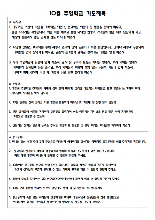 2024년 10월 유치부, 초등부, 중고등부 기도제목