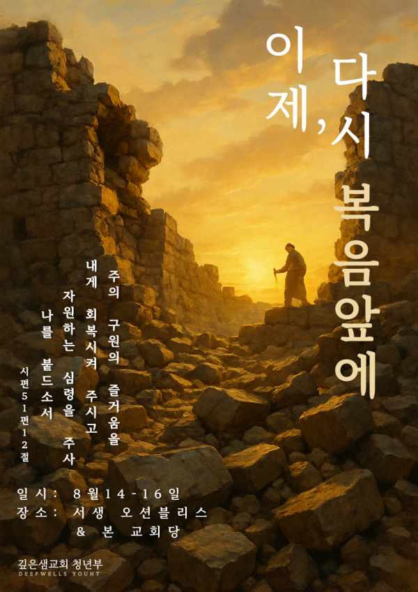 2025년 깊은샘교회 청년부 여름 수련회 2025.08.19 일시: 25.08.14(목)-16(토)장소: 서생 오션블리스 & 본교회당주제: "이제, 다시 복음 앞에"(시 51:12)